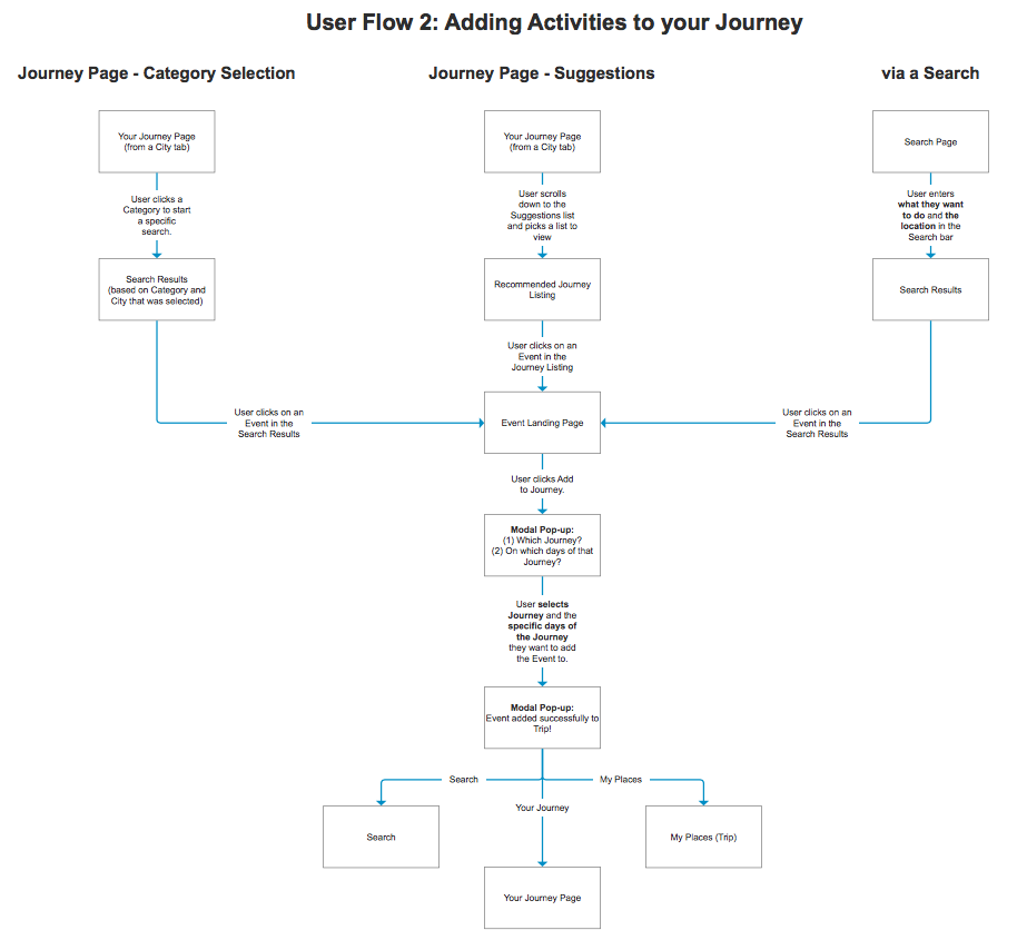 App maps detailing the placement of new features in relation to existing Yelp site content were developed in Sketch. User flow diagrams were developed using Sketch to show the user-side logic required to create a journey in Yelp. Use cases and scenarios were developed to understand how target users would interact with the new feature.